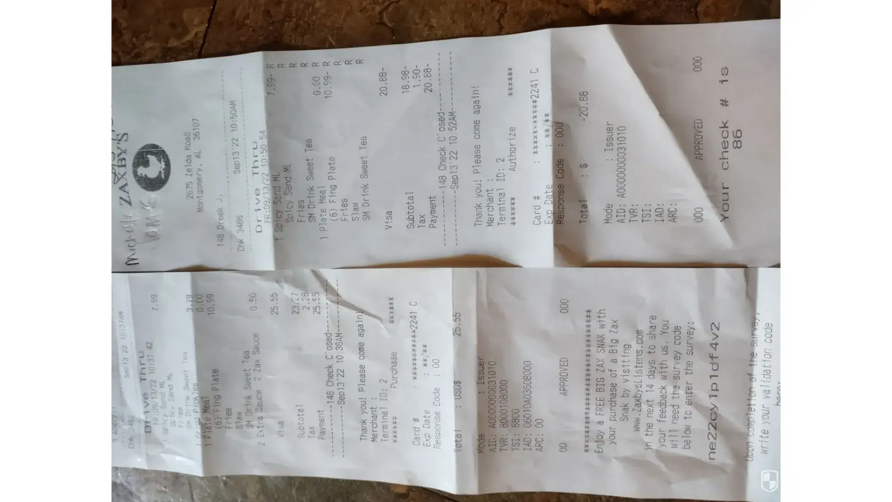 Anyhow, I explained the issue and after lying to me stating they were working on my order, then telling me my order number was something other than what was on my ticket, she finally stated they had lost the order. At that time I asked for my money back. She stated she would have to put the $$ back on my debit card, which I declined (because it can take up to a week to show up). I asked her to refund my money on a gift card. She called her district manager who informed her she could only put it back on my card or give me her district managers name and number. At that point I told her to give me the food. When I received the food, the grilled chicken on the salad was cold and we didn't even receive forks for the salad and the coleslaw! I have had issues prior to this with the Zaxby's in Calhoun, which refunded my money on my debit card, right away due to hair in my salad!