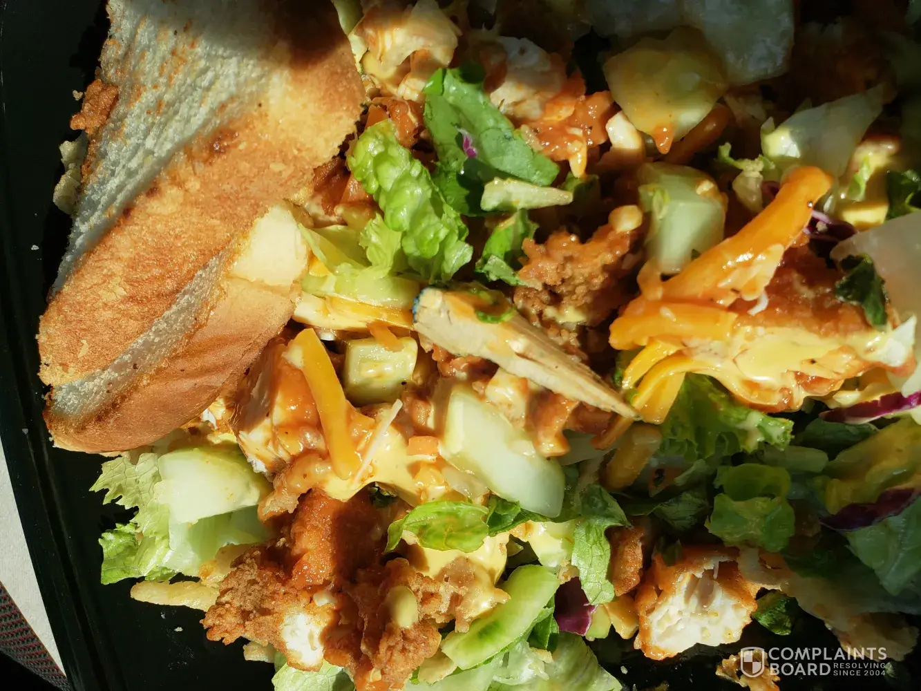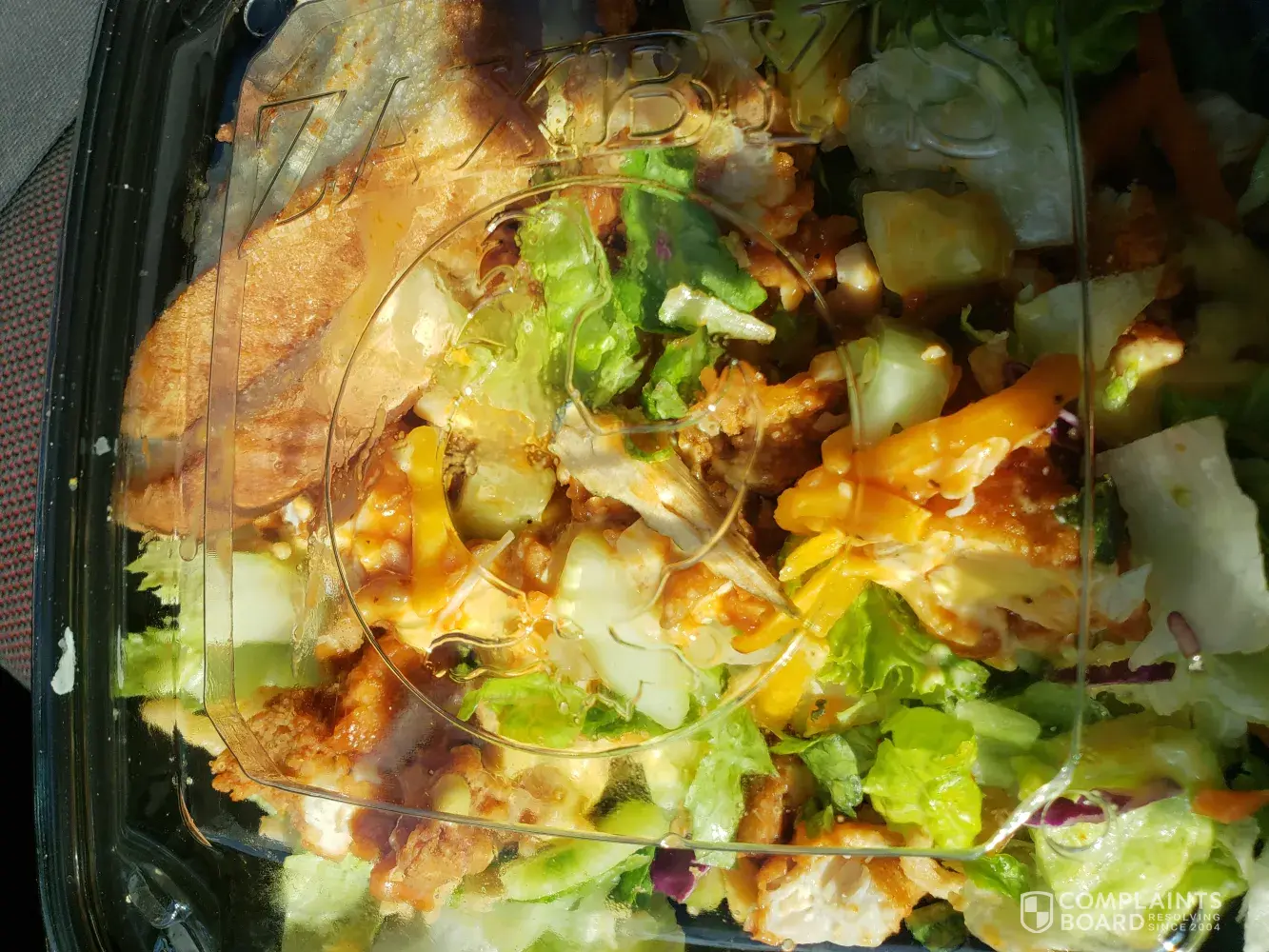 Today, 6/1, we visited the thomas murphy dr Dallas GA location for dinner. I decided on trying the new salad that came out. my husband got his normal kickin chicken meal. order was a eat in order, was given in all to go boxes, ok no big deal we will just eat it here int he containers we got it in. The salad looked really good, until I found 2 lage pieces of...