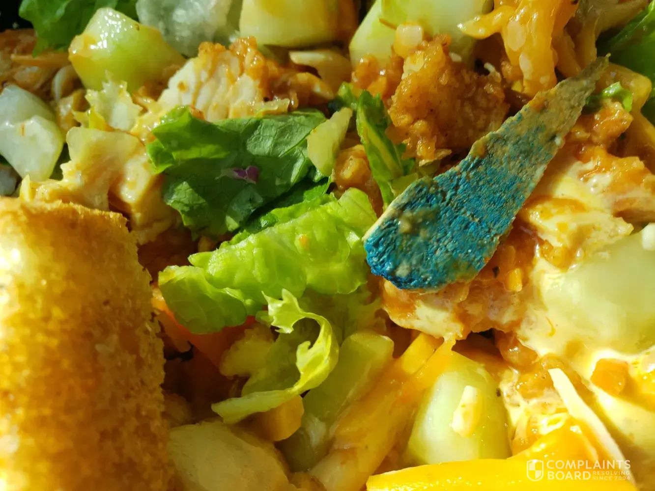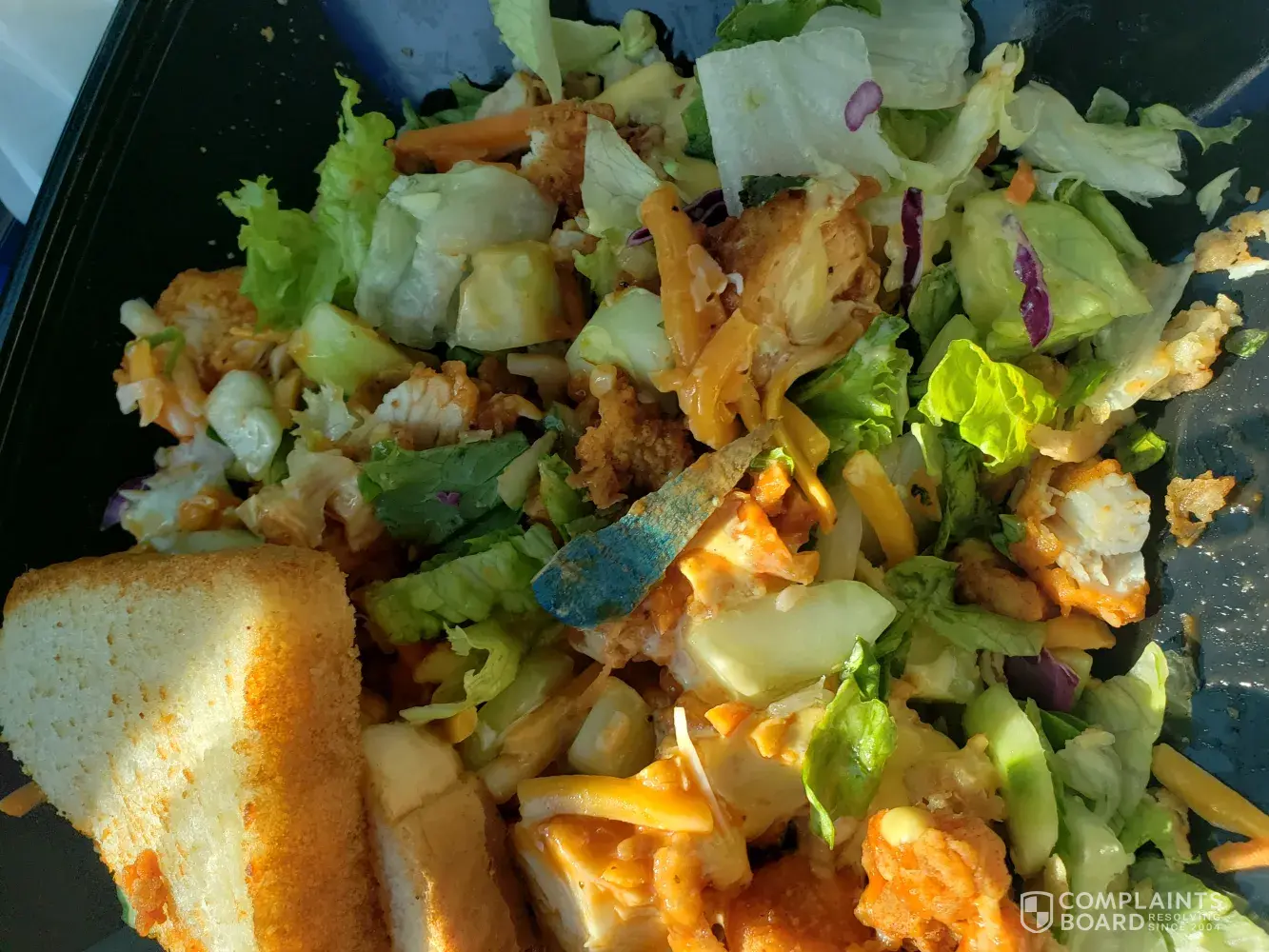 I went to Zaxby's earlier this week and ordered a House Salad Fried, no tomatoes, dipped in wimpy sauce with Honey Mustard Dressing. I went to the drive thru and went back to work. While sitting in my car (this normally where i eat lunch) i putting the dressing in my salad and mixing it up. I came across something hard. I thought the lettuce might have been hard until picked it up and noticed it was a piece of wood. I turned it over and it was painted blue on the back side. I took a few pictures and took it back to the store. I told the Manager what i found and her response was "we don't have wood here." She didn't bother to look in the sald, she just threw it away. She gave me a refund and apologized, but that was about it. She didn't seem to really care that there was a small piece of wood in my salad. I took my money and went back to work. I report this to corporate, but I never received a call or anything back. So here I am.