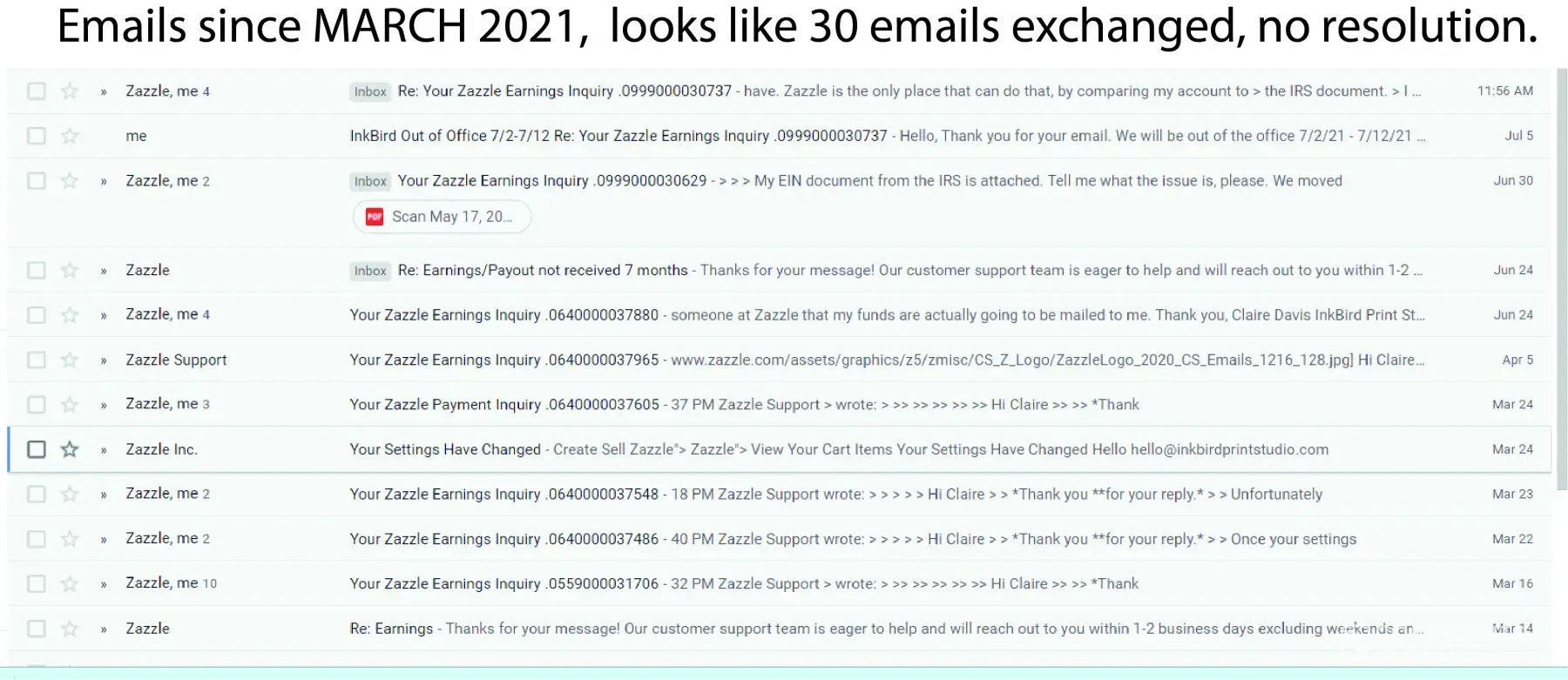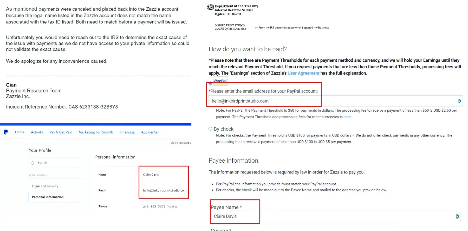 Attached are screenshots of the 30+ messages exchanged with Zazzle Support, my name/business name on my IRS document, my name on my PayPal Account, and my name on my Zazzle Account. They all look like they match to me. Tell me where the issue is.