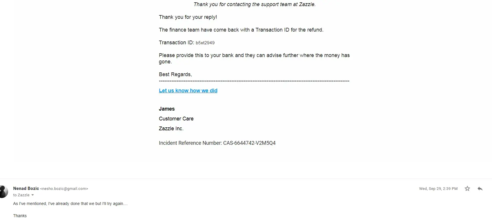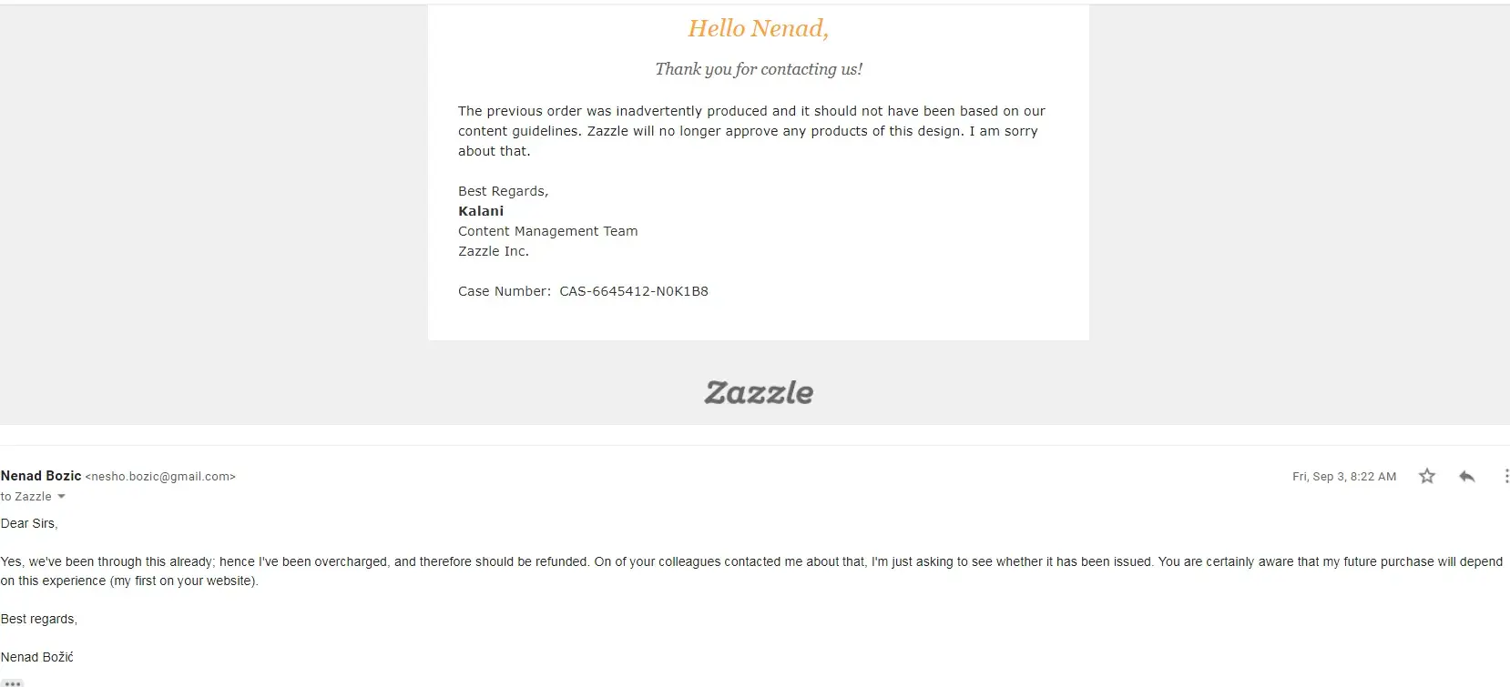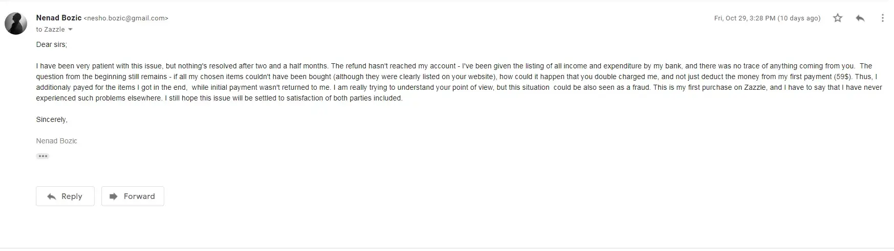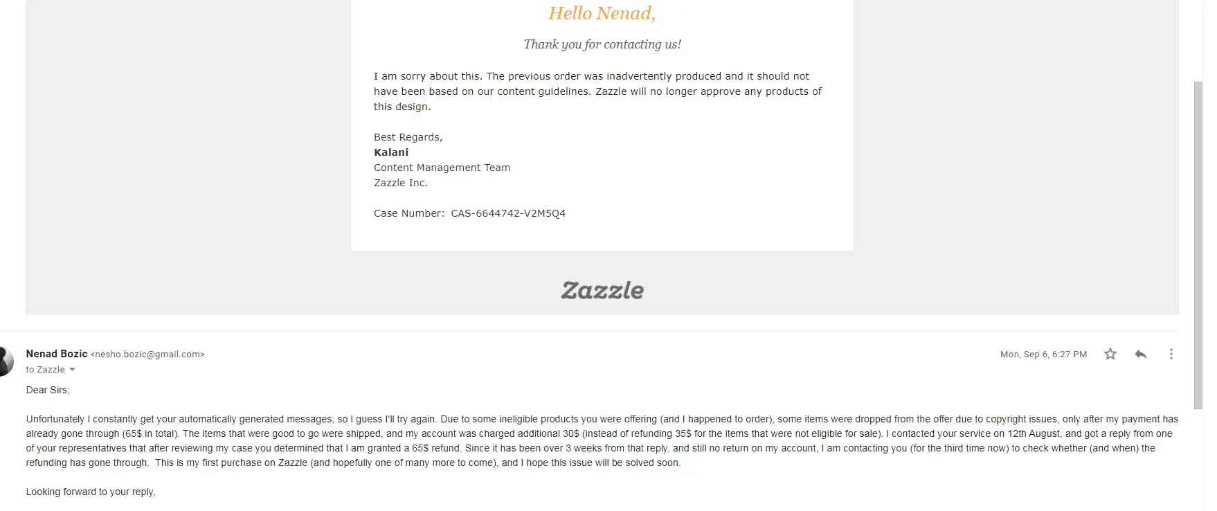 The next thing that happened - some items were removed from my order, with an explanation that they are subject to infringement copyright. My first question was, why were the problematic items exibited with a price tag on the website, and they answered that many creators sell their products through the site, so they don't keep track with all of the products. So they pulled the items out of the site, and sent me the items from my order which were ok by legal terms. BUT, I don't know how or why, instead of reducing my initial payment (around 60$), my account was additionally charged for the reduced amount (around 30$) without my consent. Of course I immediately sent an e-mail pointing the anomaly, and they answered that they had review my case, and apologized, promising to refund my initial payment of 60$. But that refund never reached my account. I wrote them again, and they kept sending me a transaction number, asking me to give it to my bank clerks, but there was no sign of any refund whatsoever. They supposedly issued a refund on 12th August, and they now stopped answering my emails, so I have no choice but to complaint and urge for a refund in other ways. Hereby I enclose the screenshots of the email corresponding with the Zazzle support staff.