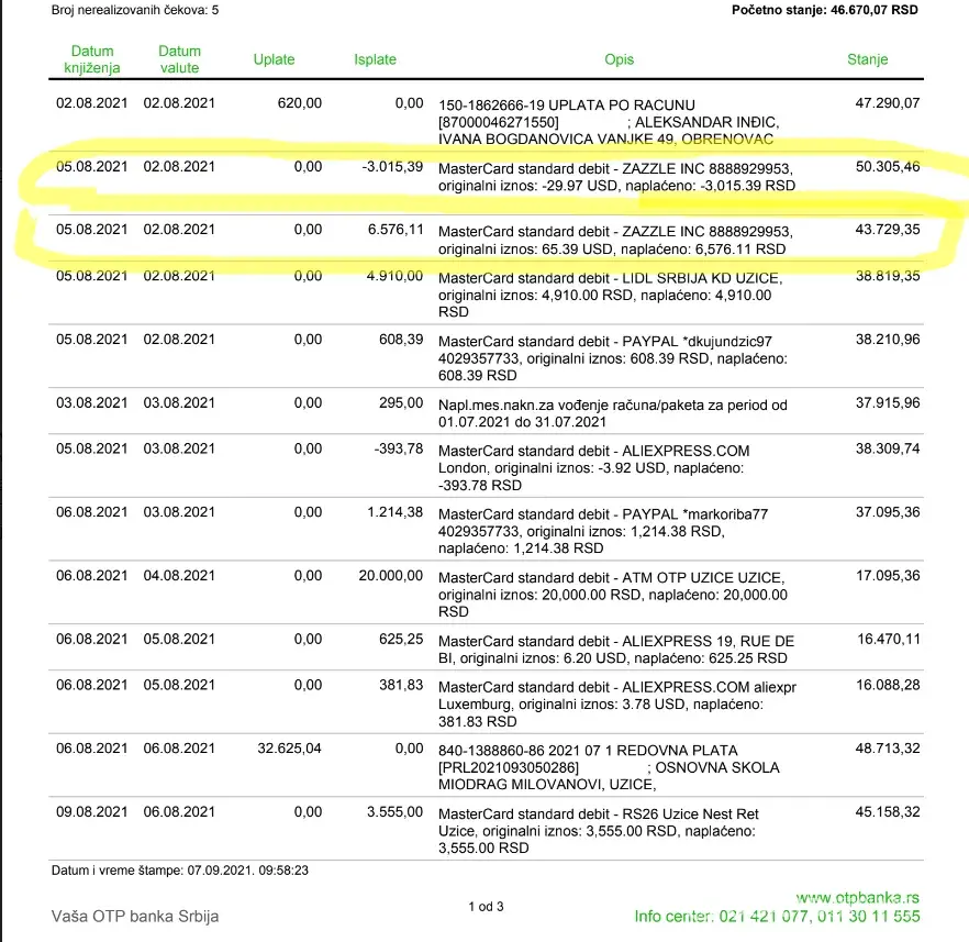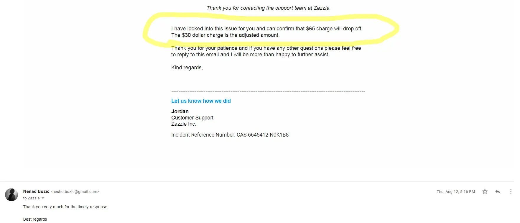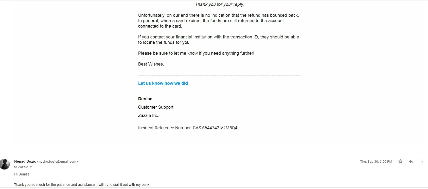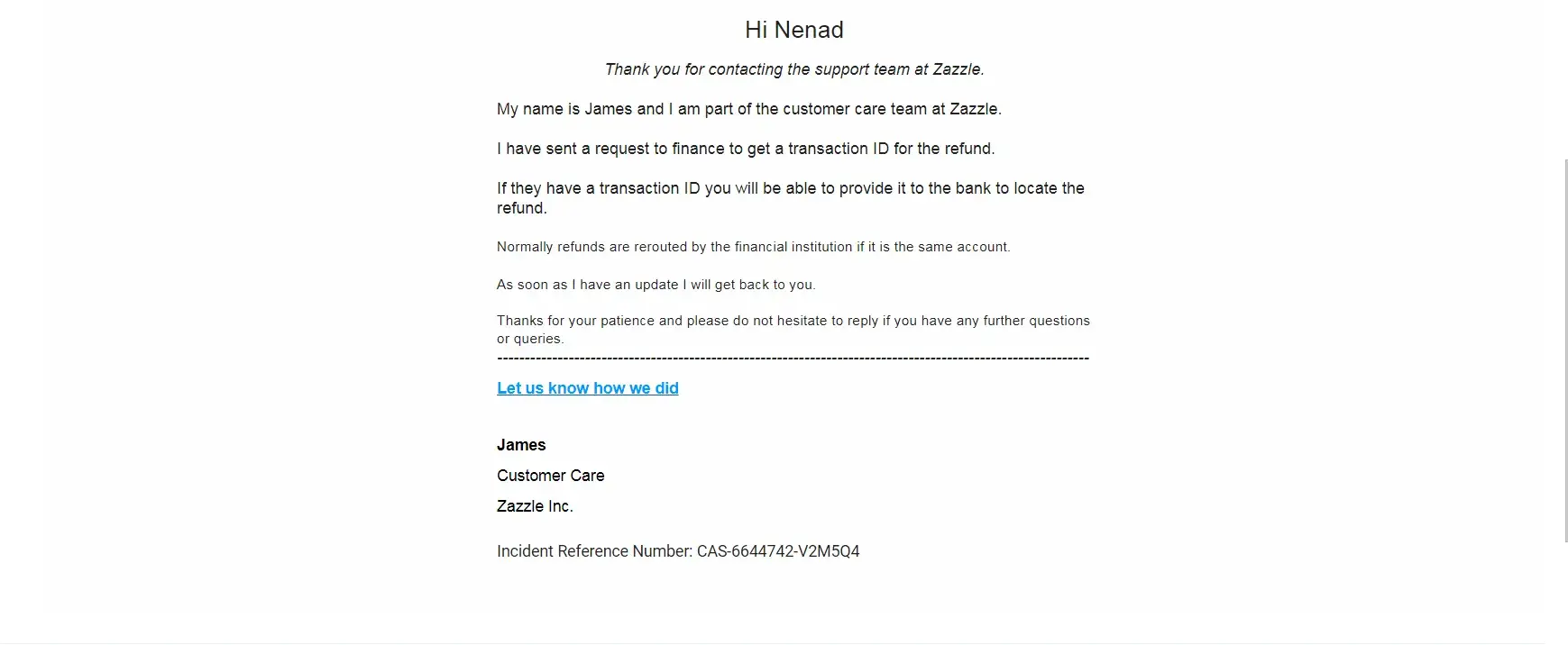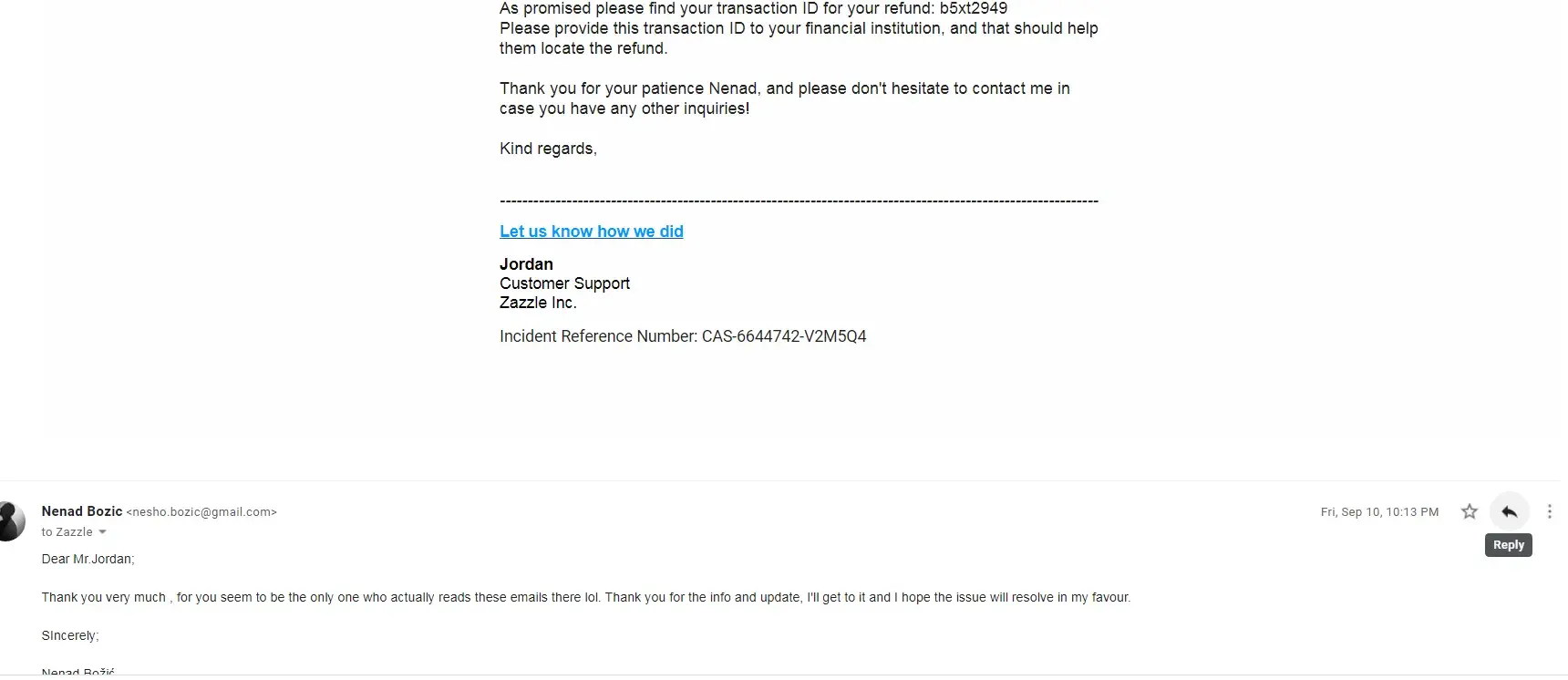 The next thing that happened - some items were removed from my order, with an explanation that they are subject to infringement copyright. My first question was, why were the problematic items exibited with a price tag on the website, and they answered that many creators sell their products through the site, so they don't keep track with all of the products. So they pulled the items out of the site, and sent me the items from my order which were ok by legal terms. BUT, I don't know how or why, instead of reducing my initial payment (around 60$), my account was additionally charged for the reduced amount (around 30$) without my consent. Of course I immediately sent an e-mail pointing the anomaly, and they answered that they had review my case, and apologized, promising to refund my initial payment of 60$. But that refund never reached my account. I wrote them again, and they kept sending me a transaction number, asking me to give it to my bank clerks, but there was no sign of any refund whatsoever. They supposedly issued a refund on 12th August, and they now stopped answering my emails, so I have no choice but to complaint and urge for a refund in other ways. Hereby I enclose the screenshots of the email corresponding with the Zazzle support staff.