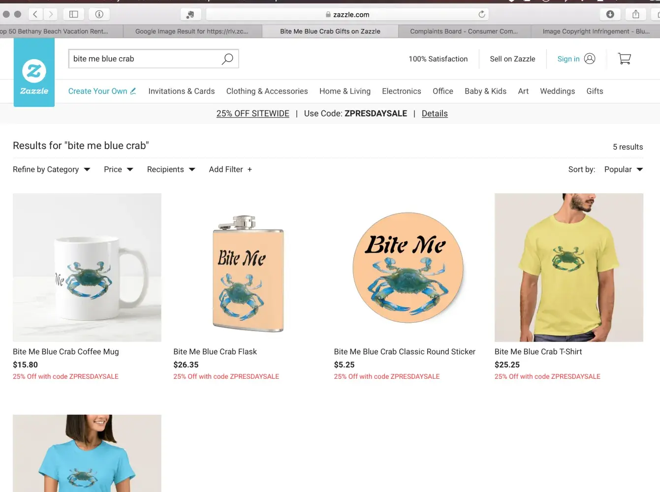 It has come to my attention that your site and vendors on it are using my U.S. copyrighted Maryland Blue Crab image in your products without permission and are not currently paying a licensing royalty for its use in your products.