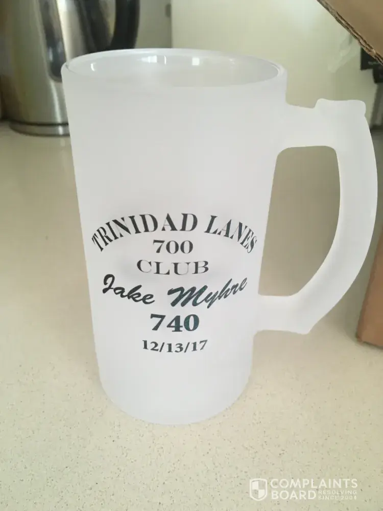 Ordered a custom glass mug on 4 May 2018 for my wife with her name and a photo on it. What I received on 8 May 2018 was a mug with someone else name, no photo and some totally irrelevant info on the glass. Clearly someone else's order.