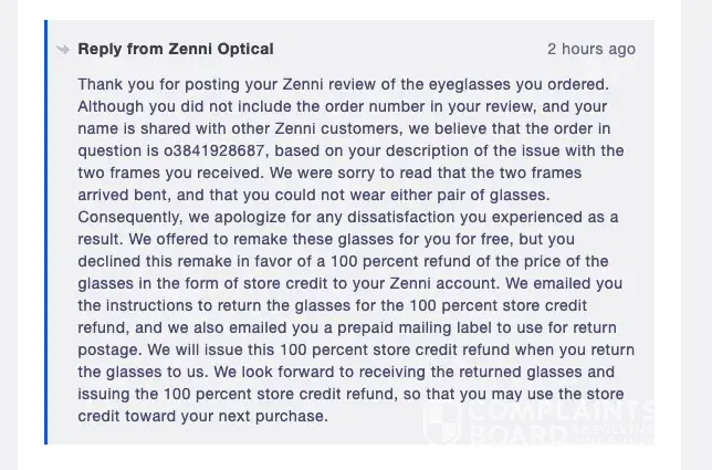 - Despite a high level of trust, our investigation found issues with Zenni Optical's service, including poor customer service, lack of accountability, and responsibility to resolve complaints. Customers may face long wait times for responses, receive generic or unhelpful answers or no response at all. Only 32% of 2 complaints were resolved.