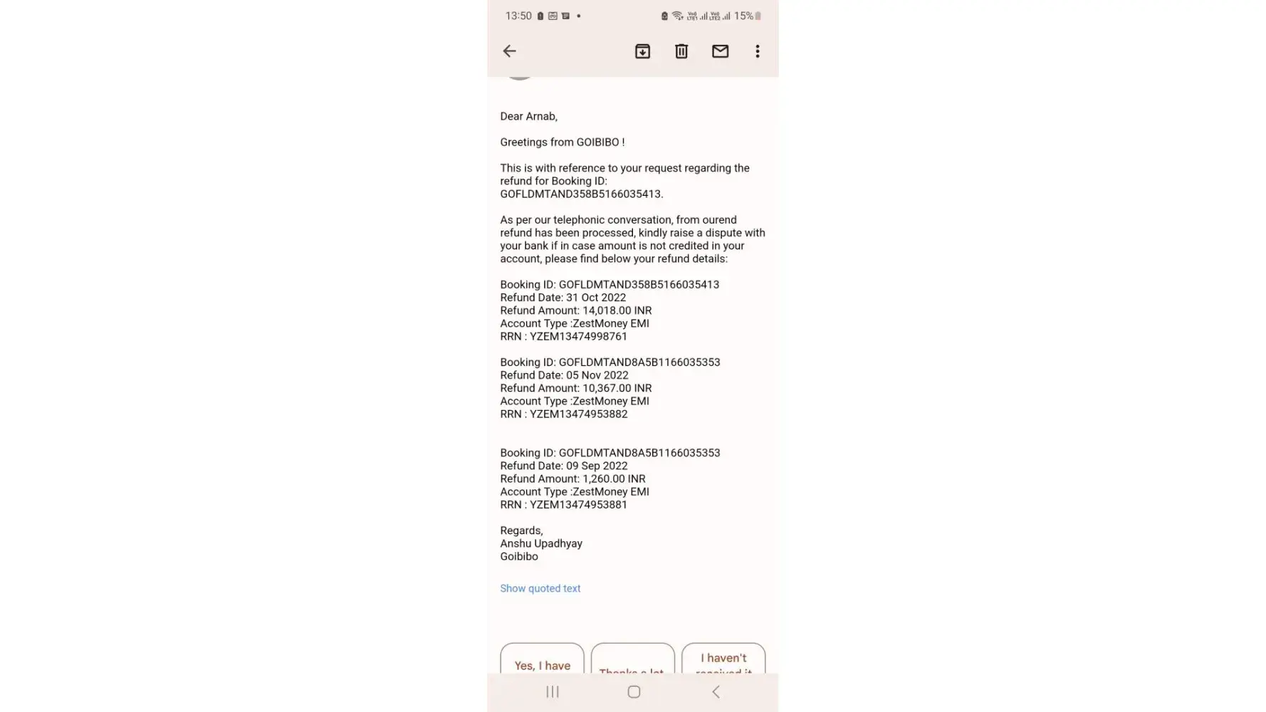 Earlier I booked two air tickets on goibibo via Zest money app.Loan id-E040M7661600,FA38FZA61F955.I cleared all the Emis on due date.Later I cancelled those tickets on Goibibo.24 days over Zest money still now refund my money.I called them 100 times but they misguide me for name of merchant settlement.