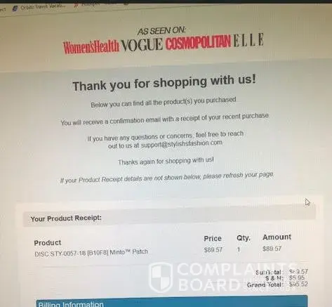 On January 15, 2020 I purchased DISC STY-0057-18 [B10F8] Minto Patch for 95.52 USD I never got a confirmation e-mail, receipt or shipping information from you. It has been already 2 weeks that I keep on sending e-mails to support@stylishsfashion.com and still don't receive any information regarding my purchase. I want my money back. I did it through PayPal thinking was the most secure and safe method to do this purchase. Now I'm believing that you are scammers. I also dispute this charge to paypal and they are not doing anything, is just forwarding to you my complaint. Sent an e-mail with my complaint to disputes@resolutionsupports.com and my bank. I took a picture of the purchase of my computer screen, that is my proof and the charge in my bank account.