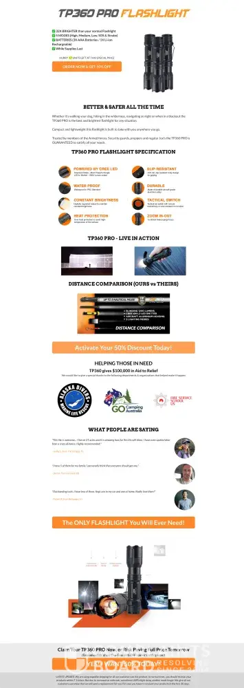 This is a bait and switch scam showing a much higher quality product with promised specifications and what was delivered is complete junk that is not even close to what was described. They claimed that the flashlight was 1200 lumens and could shine three nautical miles. They show numerous pictures of a flashlight and videos of the use of the flashlight. The flashlight I received was nothing like the one that they were selling on the webpage. Their webpage is now down with a 404 error.