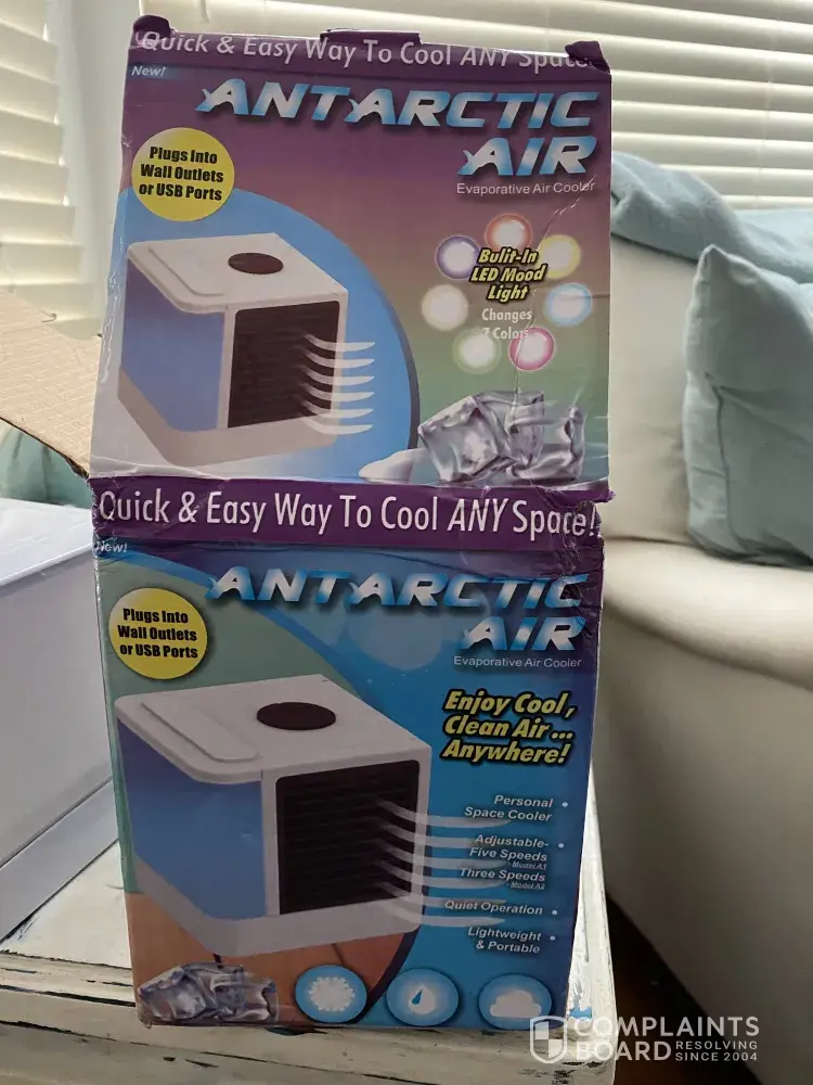 I only received one and it was a "Anartic Air. It was missing its plug and only came with a USB plug. The box looked used and was obviously a return and not a new box. The product does not work and puts out a "Trickle" of air barley able to notice and does not cool as small room as advertised. I also have the warranty purchase. See below.