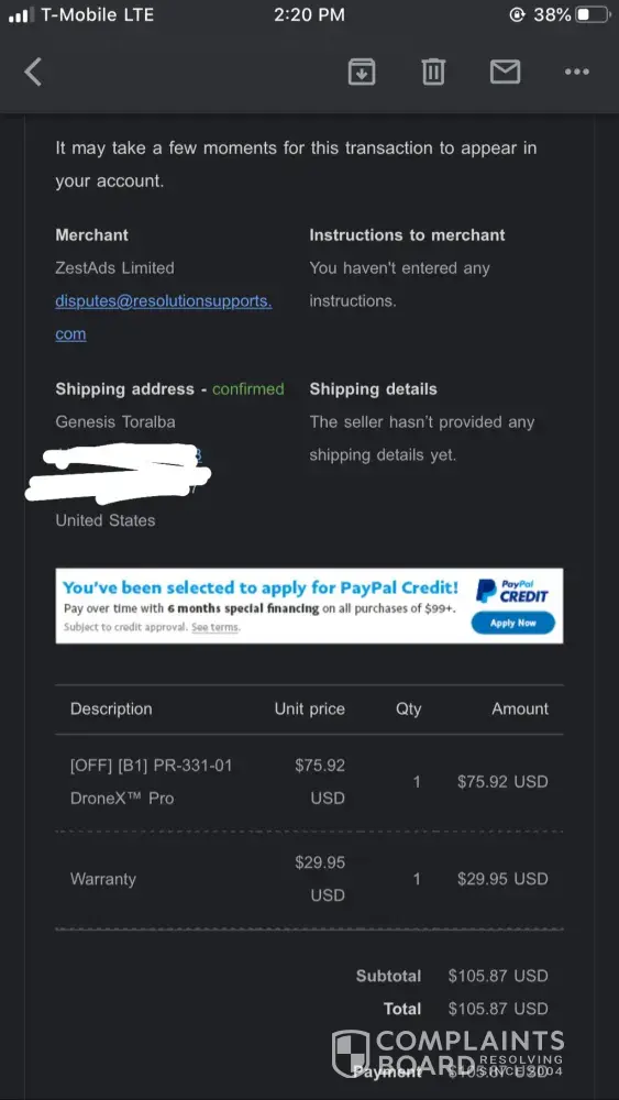 I have ordered two drones about a week ago and still haven't been provided with any shipping details. The ad appeared to be legit and a trustworthy company, but by now I should have been provided with shipping details and a tracking number and have neither. And now that I've looked up ZestAds...I'm not the only they have done this too. I want a full refund.