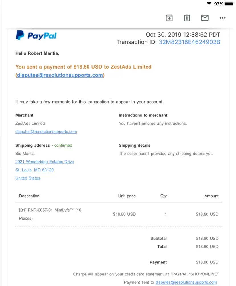 Transaction ID: 7WV87180LM460491F I sent $50.75 for five black mobile charge cables. I have had no contact from the company or delivery details. I have received a message from PayPal that my payment went to to disputes@resolutionsupports.com