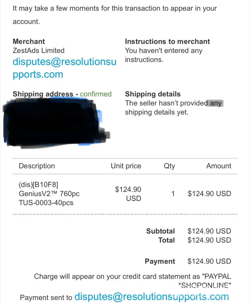You sent a payment of $135.85 USD to ZestAds Limited (disputes@resolutionsupports.com)