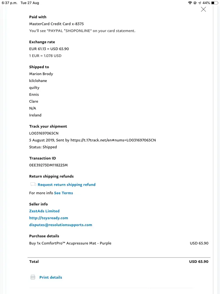 I bought an acupuncture pressure mat from Zestads through PayPal. I have emailed the company several times but no reply. I was not at all happy with the product, it's made from flimsy poor quality material and the mat is a lot smaller than advertised. I want to return the mat and get my money back. They won't answer my emails, what can I do to get through to them?