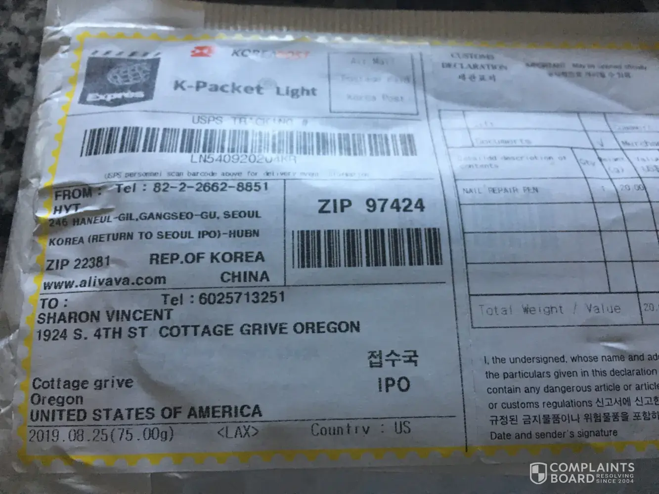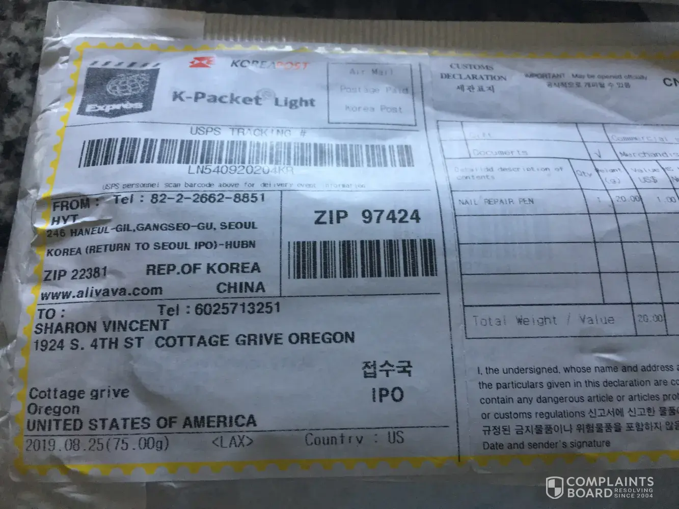 Received in the mail - 2019-08-25 HPS 134-05 NailFresh (Monthly #1) Value $27.85 TEL: 82-2-2662-8851 HYT 245 HNEUL-GIL, GANGSEO-GU, SEOUL KOREA (RETURN TO SEOUL IPO) -HUBN ZIP 22381 REP. OF KOREA www.alivava.com CHINA