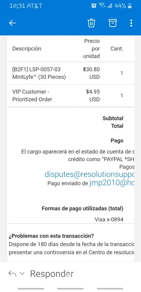 Buenas tardes el 25 de Enero pedà los parches de menta por un costo de 30.80 y hasta la fecha no recibo ningún email de confirmacion del pedido; numero de envio ni nada al contrario me cobran 26.95 dolares más. Necesito una respuesta urgente