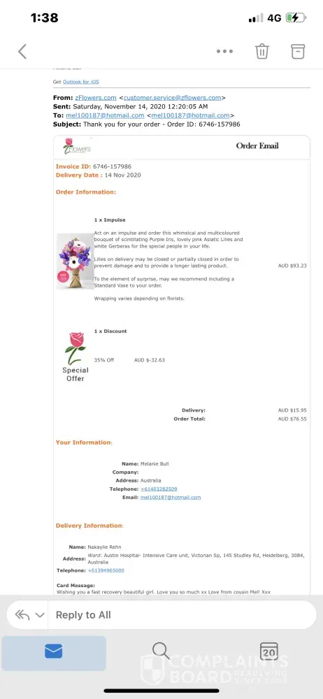Ordered flowers to be delivered on 1st April. (will attch pics)was not what I had ordered looked nothing like what I thought I was getting. Rang company their response was basically bad luck. Would like to hear from someone about a refund. Very disappointing as this was a birthday gift. Ordered from website Zflowers which is based in phillipines but does not state this on its site says Como W.A.