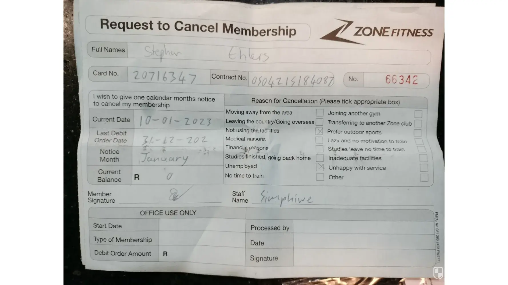On 10 January 2023 we went to the gym in Hatfield to cancel to 2 contracts. Simphiwe then cancelled the contracts with immediate effect ...I have the 2 receipts as proof.