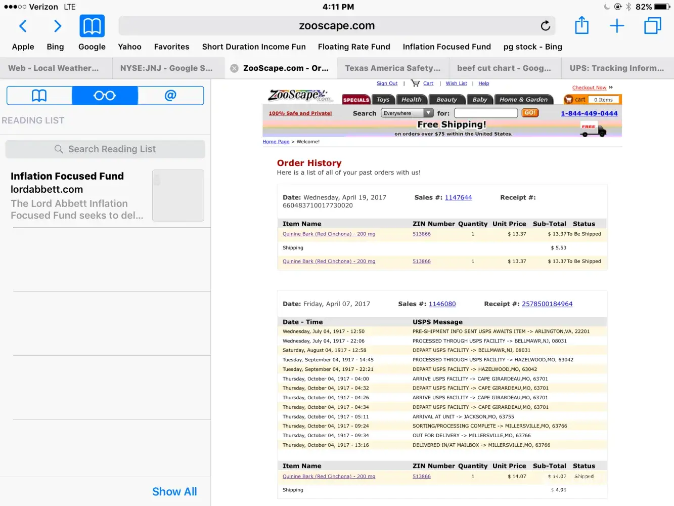 Purchase Quinie Bark 200 mg on April 19 th x 2 bottles. Each bottle cost $13.37 plus shipping, total $32.27. Credit card has been charged but still have not received product. I have tried calling 6 times with a message that memory is full. I have e-mailed them 5 times at [protected]@ZooScape.com with no response. I have not been able to get any type of response from company. I gave entered a complaint with BBB. I will be having my credit card company work through this matter.