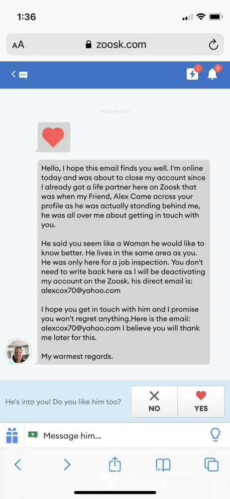 My handicapped and disabled brother was "catfished" by a member of the Zoosk dating site. It is currently under a police investigation . Zoosk needs to confirm people are who they state they are especially since money is given for membership. My brother as a challenged senior citizen has suffered greatly. The "lady" he was talking with pressured continually for money so "she could fly out from Missouri and be with him". Luckily his banking institution was on its toes. I had to redirect money being sent twice. Then I had to go back to his investments people to cancel another attempted money scam involving the same Zoosk member. The final part was several phone calls wondering what happened to the money. My son had power of attorney and we have been in contact with our family lawyer. I am going to be in contact with the FBI scam division as well as this is an interstate crime.