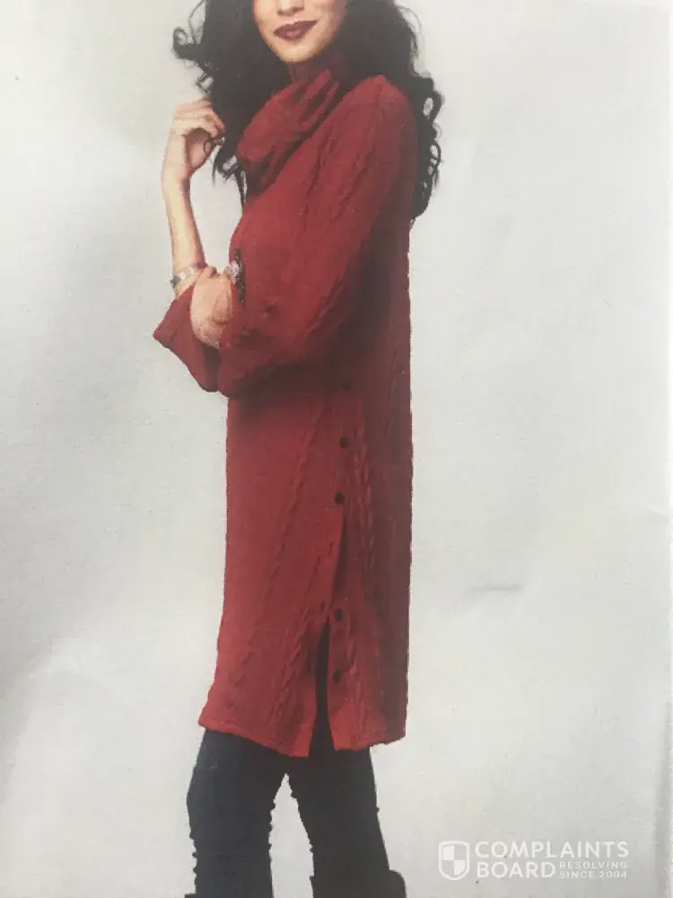 Item was ordered December 2nd and meant to be a Christmas present. Arrived January 14th. Image our dismay then the item was not at all as expected. In the photo, the item had cute black buttons up the left side and was a straight cut. What we received was very short (even though we ordered the 1X to be long enough per your site recommendations), a-Line and had no opening with buttons.