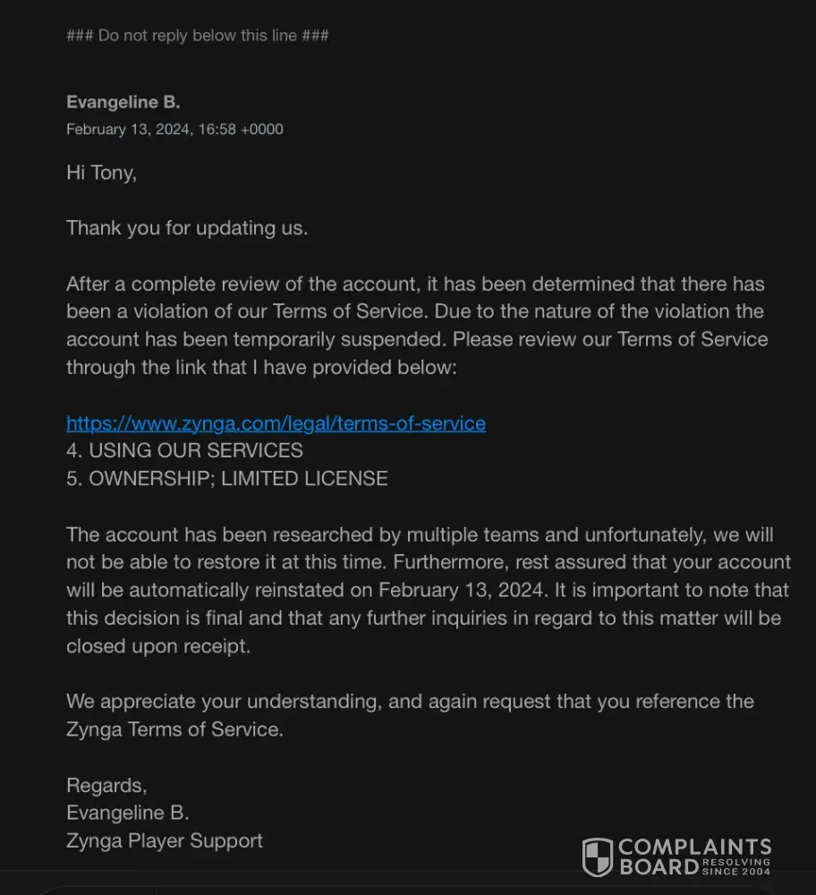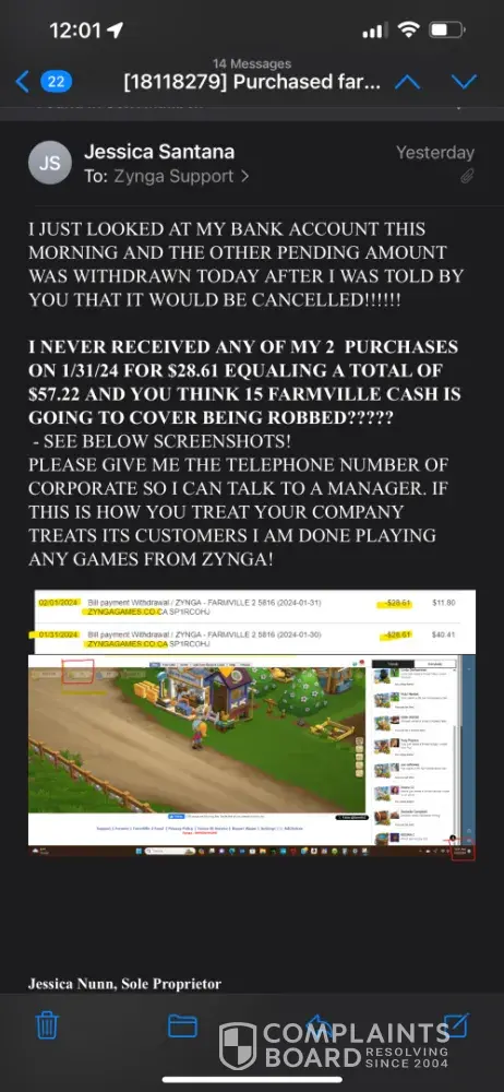 - While Zynga has a high level of trust, our investigation has revealed that the company's complaint resolution process is inadequate and ineffective. As a result, only 15% of 444 complaints are resolved. The support team may have poor customer service skills, lack of training, or not be well-equipped to handle customer complaints.