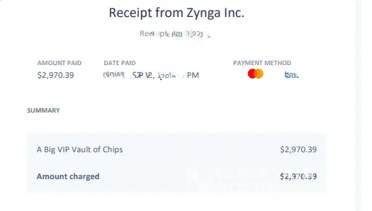 Zynga removed all my chips gold and tickets. 33.1 trillion chips 333,867 gold 37,871 tickets. First they said i bought them illegally. I have receipts they were bought from the Zynga store. So now its I'm selling them, my chip balance indicates otherwise. They change again inappropriate game play and say they have evidence of me doing terrible things. I ask what are they referring to. They refuse to say or provide any proof of wrong doing. They continue to accuse me of several different things constantly changing their minds. It's hard to keep track. I have never breached their rules and all my chips and gold are legally paid for. I have proof of purchase. Those chips cost a lot of money. Its theft. Attached is just one receipt