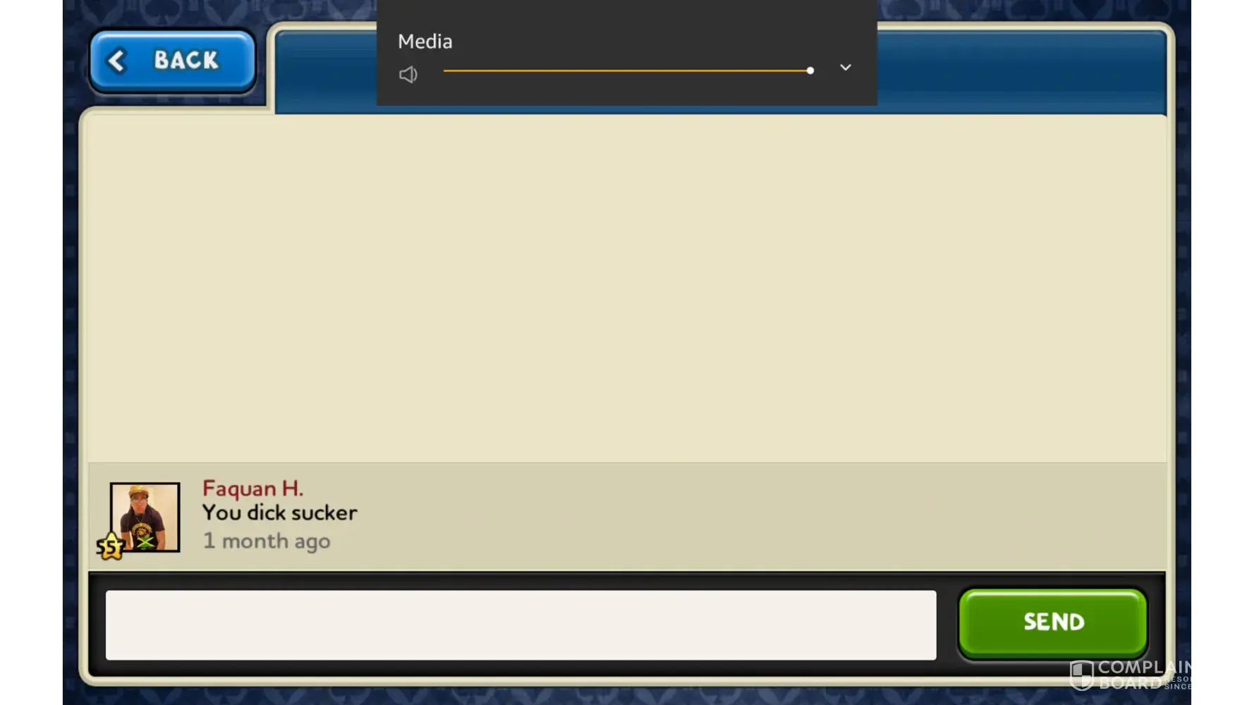 A vulgar comment was made to me. And I mean VERY vulgar! I reported ,along with keeping original message. Nothing was done. He is still able to play. He is Not my friend, but because he messaged me, I can see how many games he has played. Can't believe they allow this. Again, I do have the original message he set. It shows his name, games played and stats. I have reported his behavior to 3/4 different times. Not one response. I will be glad to send you his nasty message.