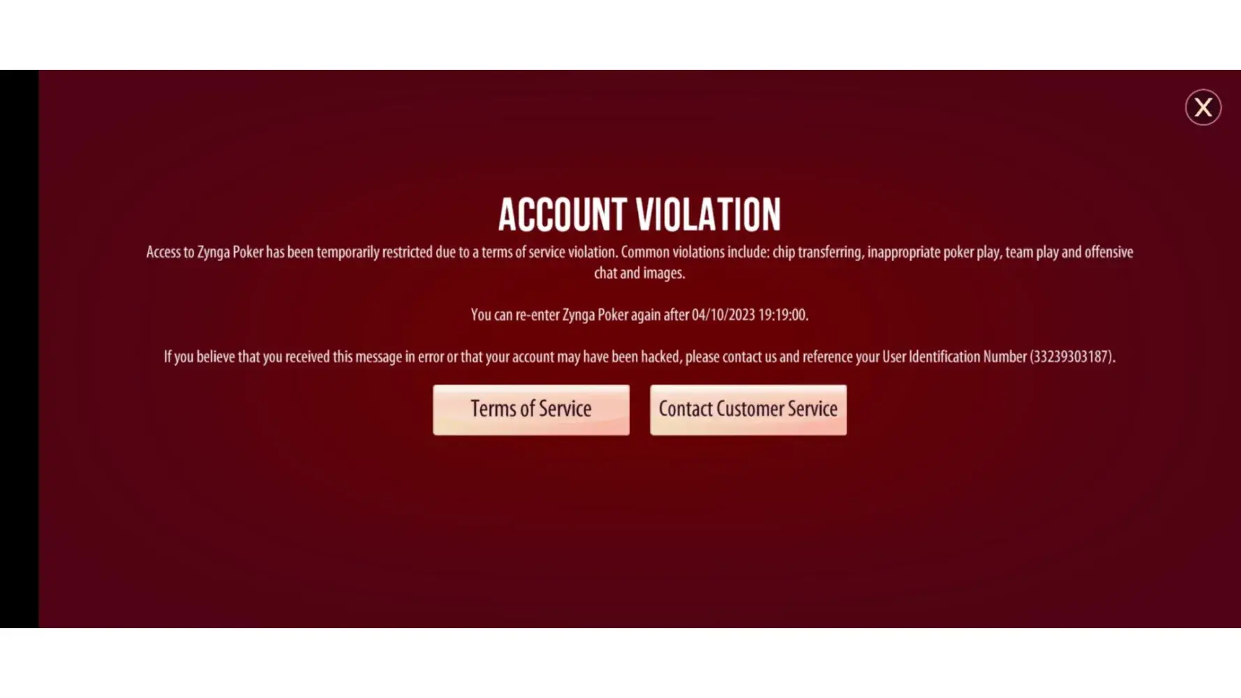 I was very disappointed to learn that my account had been temporary banned today 8/4/2023 till 4/11/2023, as Zynga Poker is a game that I enjoy playing very much. I understand that the team has strict rules in place to ensure a fair and enjoyable experience for all players, and I want to assure you that I take those rules seriously. I have always played fairly and have never used any third-party software or cheat programs. I value the integrity of the game and the importance of maintaining a level playing field.