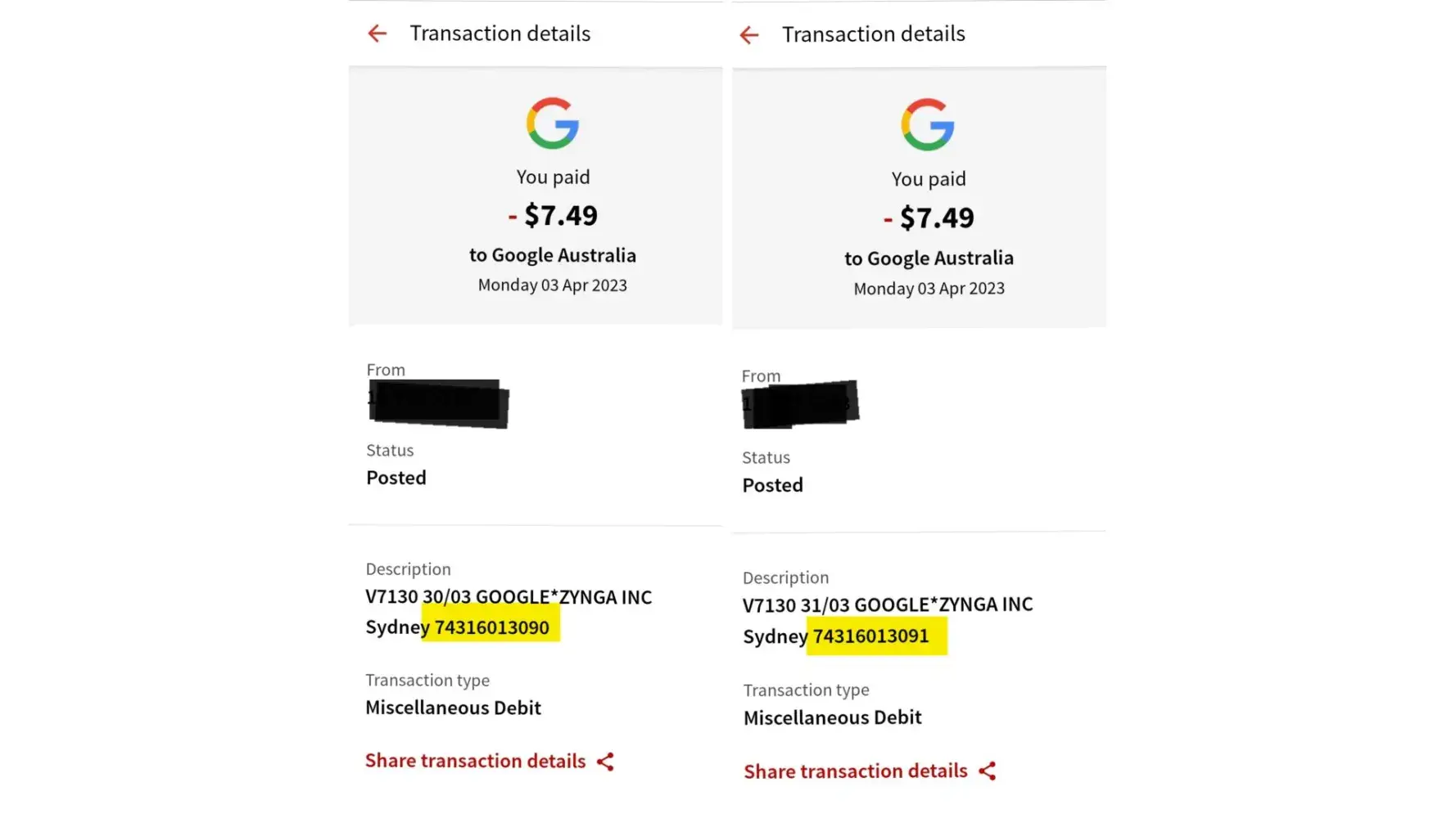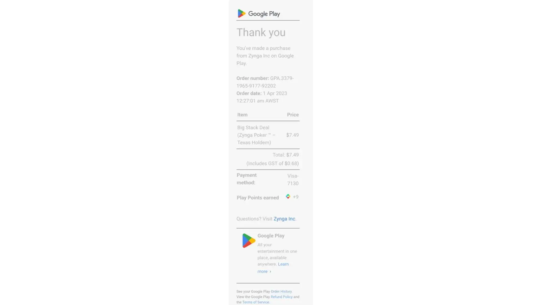 I been play Zynga poker for long time. Recently I had spend $7.49 bought chips to keep play because I been on really high level. So I bought in 31th March midnight. And received from Google play Email 1 recipe on 1 April for my purchased. But I found out my bank account at 3th April had charge me twice $7.49.