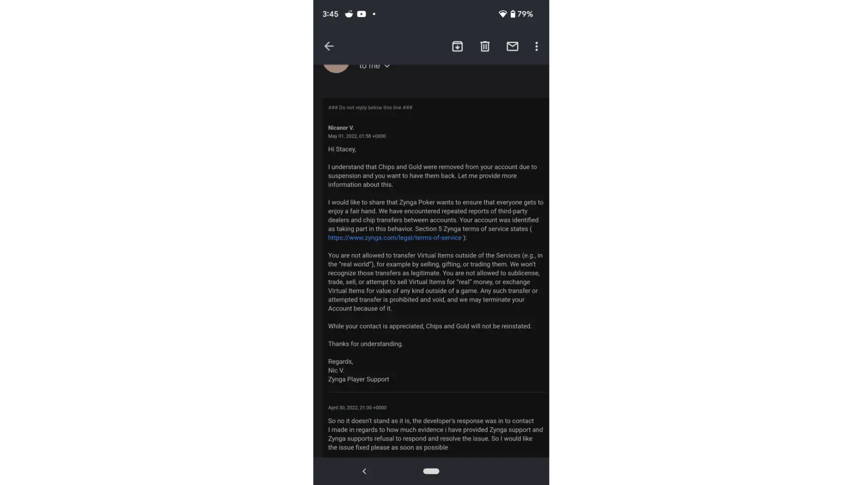 Zygna responded , simply , they had review my case and I would not receive any of my chips back.