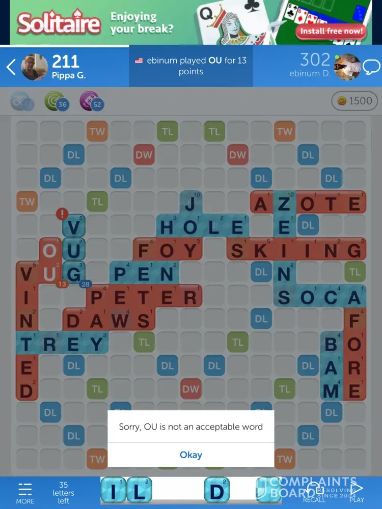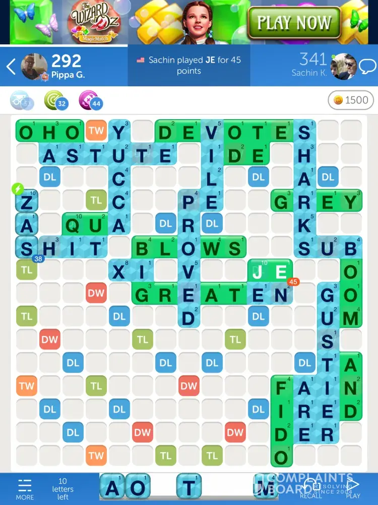 There are several issues with WWF. Firstly, the dictionary is appalling, and it's even worse if you use the UK Dictionary. Perfectly acceptable words are not recognised, while initials, not even forming acronyms, often are allowed. In one game, a completely unacceptable two-letter word was placed by my opponent and allowed, while my next move, attempting to place the identical "word" was disallowed. I have screenshots, as it's happened more than once.