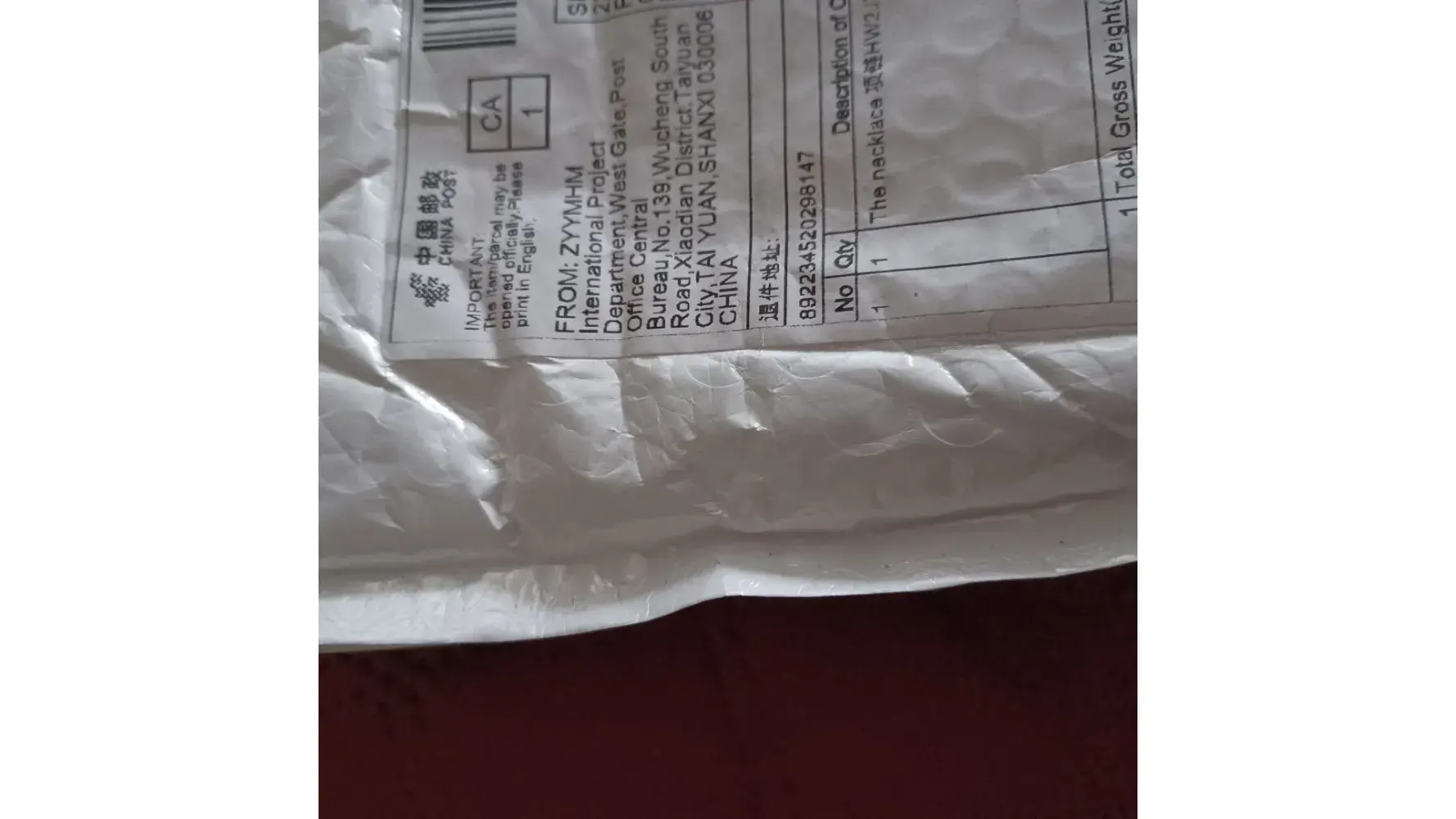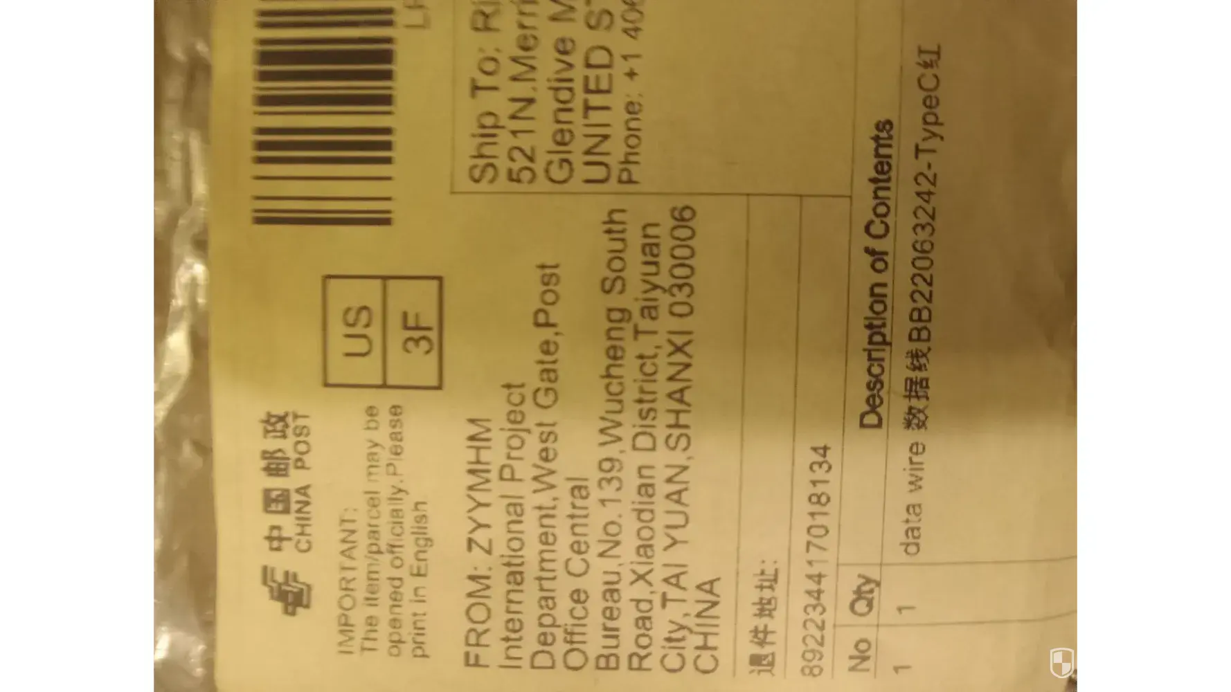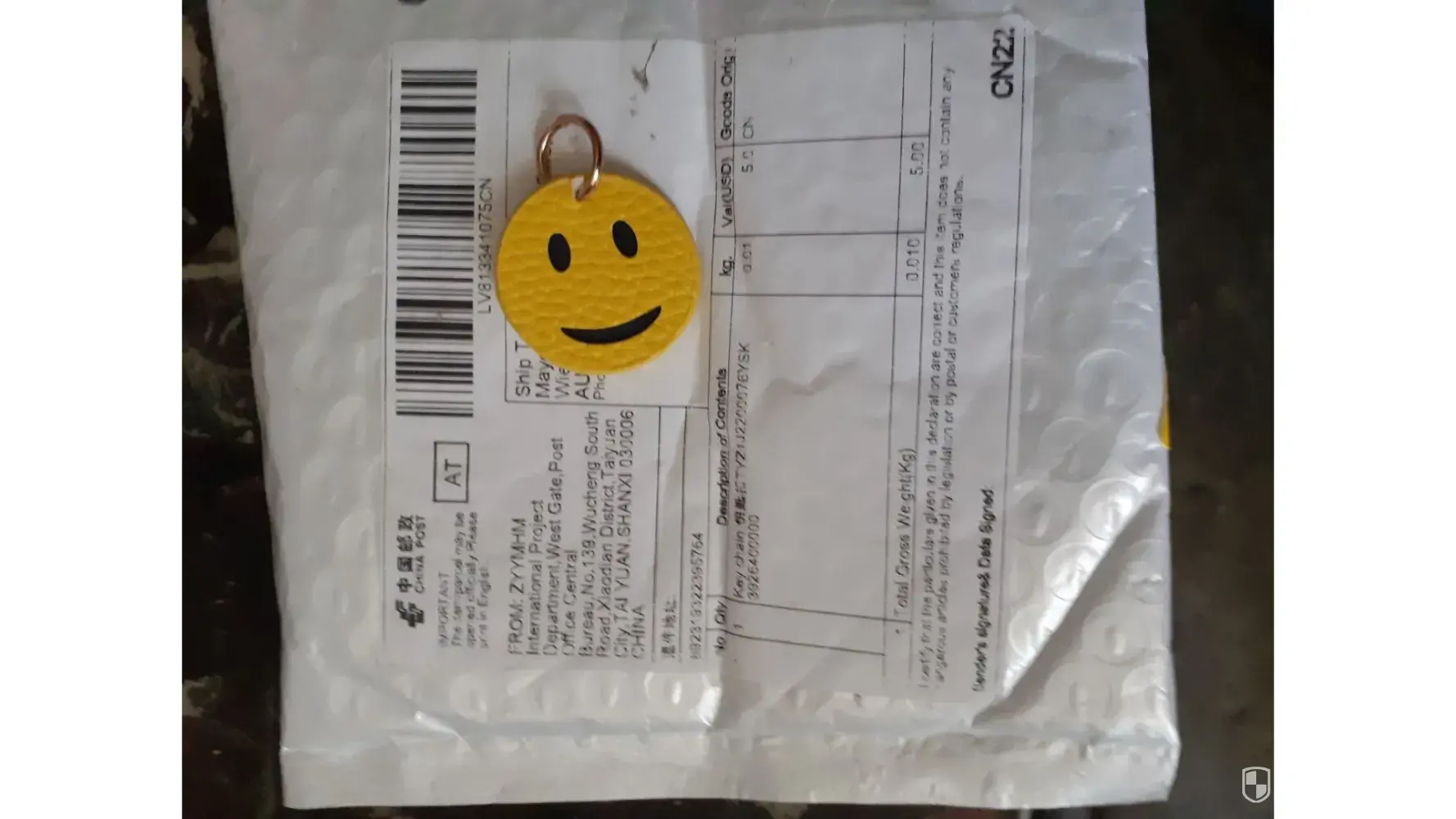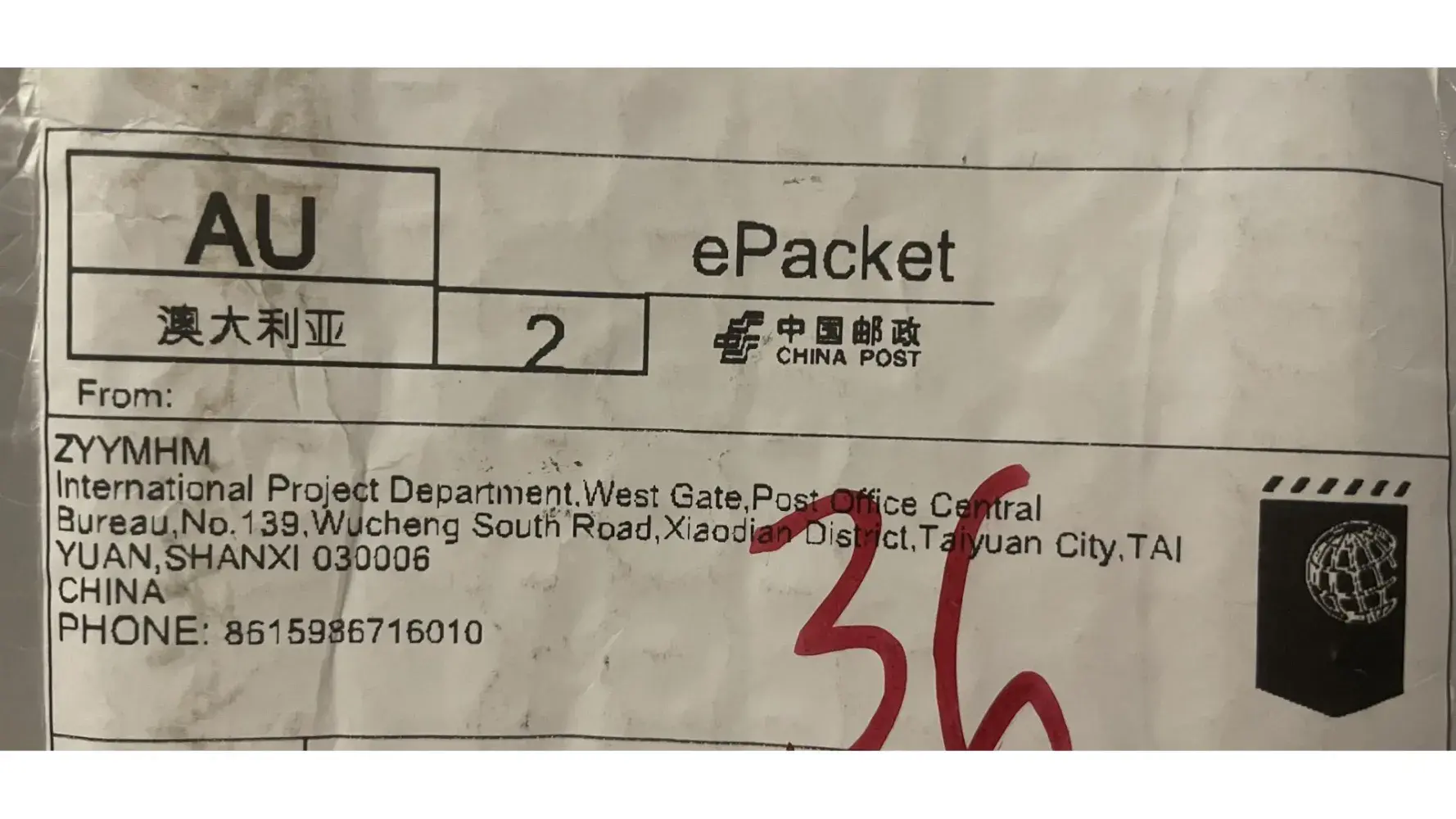 The parcel came from ZYYMHM