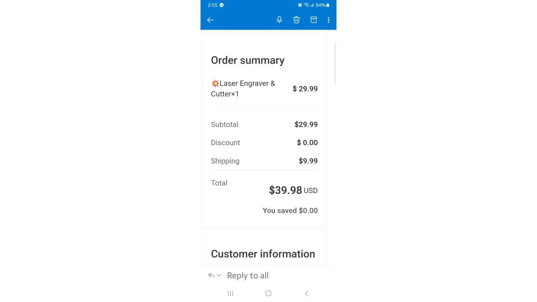 I ordered a laser engraver I got a cheap necklace. I E mailed customer service at least 6 times no reply no cancelation like I asked